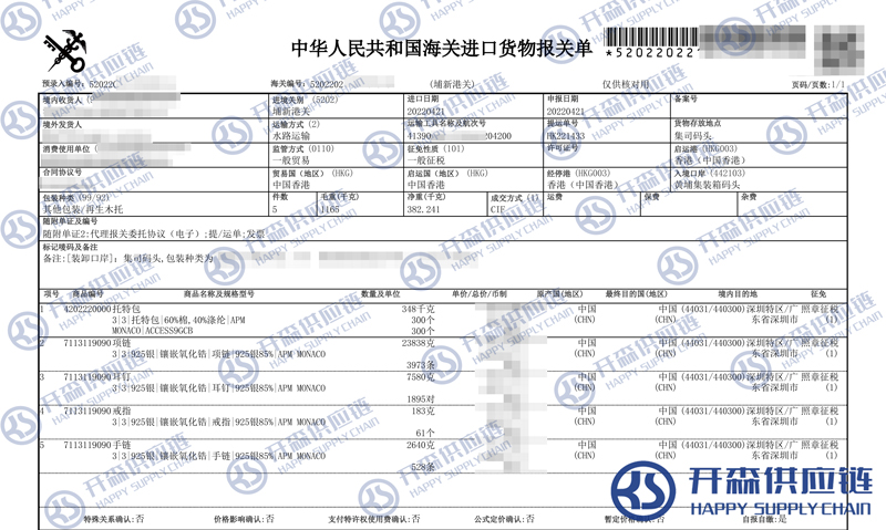 開森進(jìn)口供應(yīng)鏈擁有豐富的珠寶首飾進(jìn)口報(bào)關(guān)操作經(jīng)驗(yàn)及案例,十余年操作經(jīng)驗(yàn)及案例可供參考,可按需定制珠寶首飾進(jìn)口方案,幫助客戶解決進(jìn)口難題,快速進(jìn)口清關(guān)到港到貨。