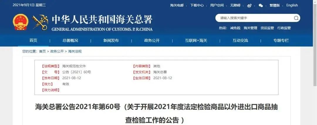 8月12日,海關總署發(fā)布2021年第60號公告,決定對2021年法定檢驗商品以外的部分進出口商品實施抽查檢驗,抽查檢驗的商品范圍涉及20類進出口商品,其中進口商品13類,出口商品7類。