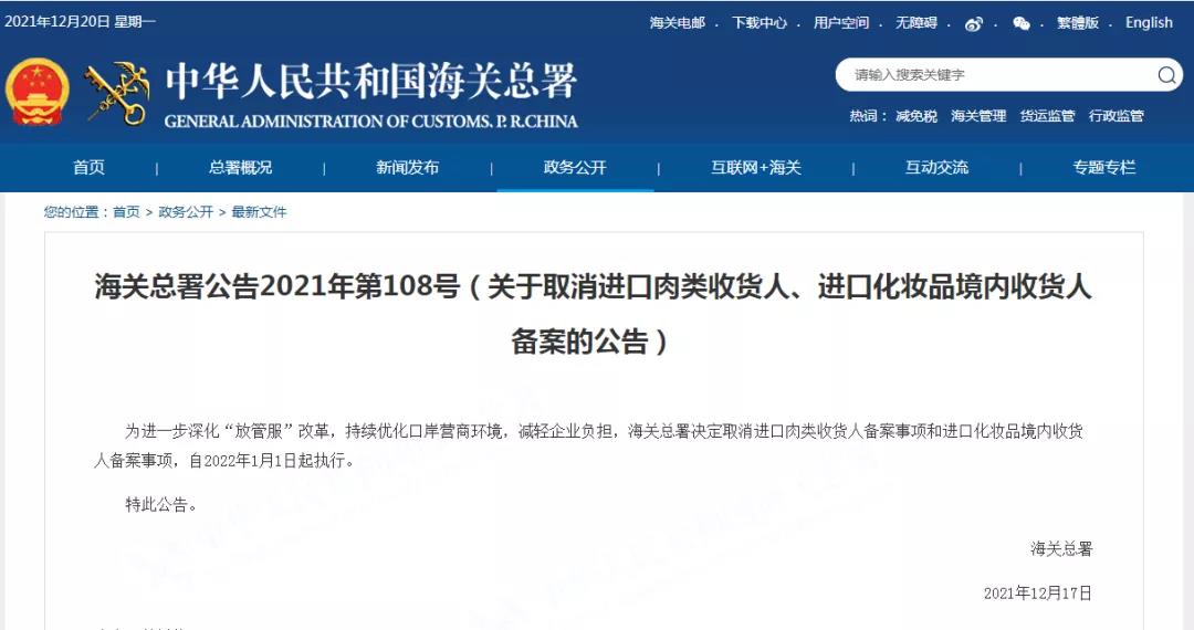 2021年12月17日,海關(guān)總署發(fā)布2021年第108號(hào)公告:為進(jìn)一步深化“放管服”改革,持續(xù)優(yōu)化口岸營(yíng)商環(huán)境,減輕企業(yè)負(fù)擔(dān),海關(guān)總署決定取消進(jìn)口肉類收貨人備案事項(xiàng)和進(jìn)口化妝品境內(nèi)收貨人備案事項(xiàng),自2022年1月1日起執(zhí)行。