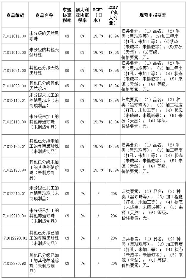 整顆珍珠應歸入7101項下,再根據珍珠種類、天然或養(yǎng)殖等進行詳細歸類。其中,黑珍珠因為比較稀有,價格較為昂貴,在《中華人民共和國進出口稅則》中單獨列名。從部分國家和地區(qū)進口是可以享受優(yōu)惠關稅的,下面介紹珍珠可能涉及的歸類、規(guī)范申報要素及進口關稅稅率:
