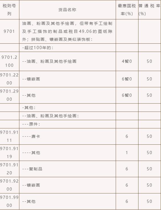 根據(jù)《中華人民共和國(guó)進(jìn)出口稅則(2022版)》,繪畫作品的稅則號(hào)列和部分稅率如下(協(xié)定稅率及特惠稅率等詳見2022年稅則):