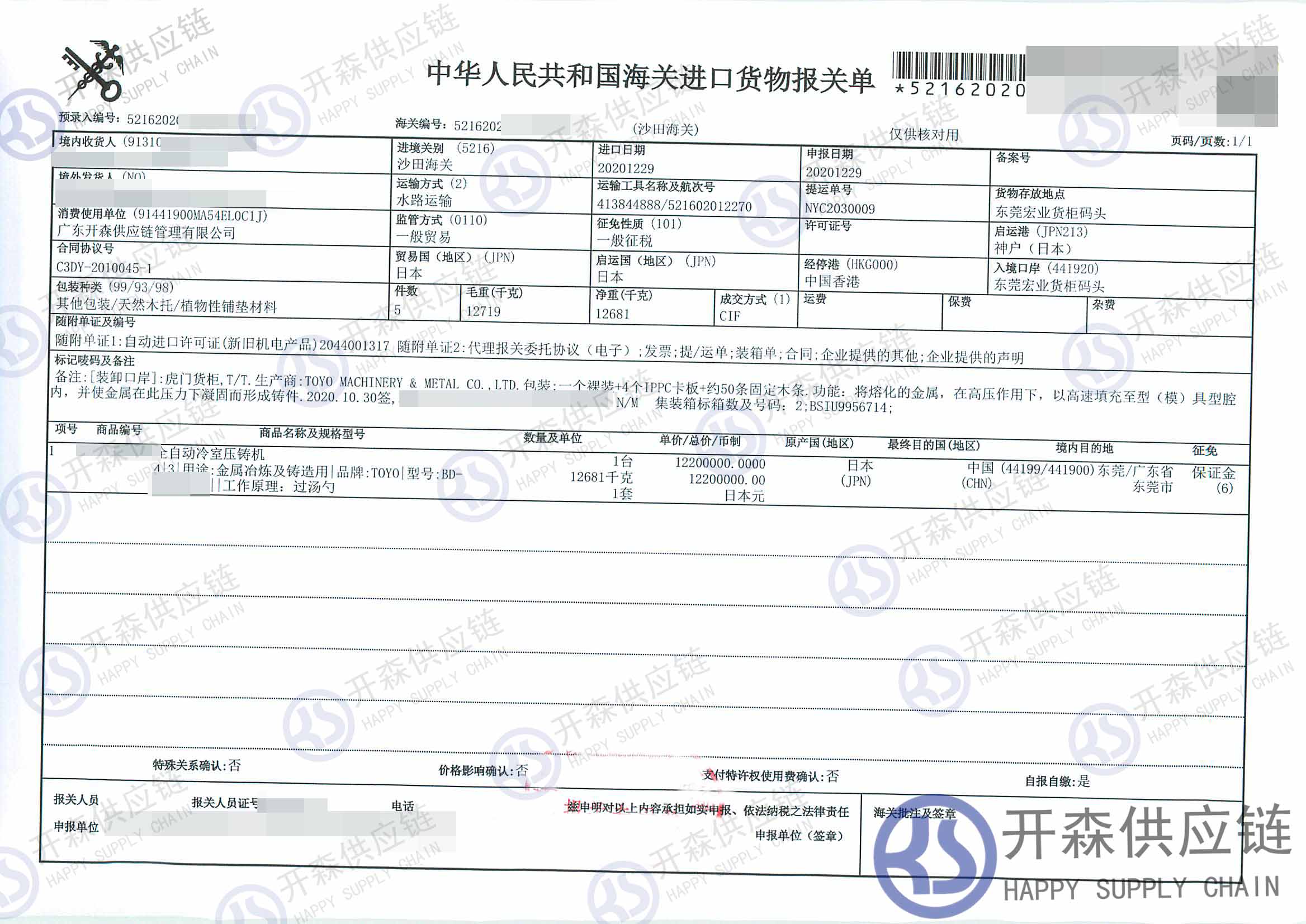 上述就是【進(jìn)口案例】東莞碼頭全自動壓鑄機(jī)進(jìn)口報關(guān)代理服務(wù)的全部內(nèi)容,希望能對您有所幫助,如有機(jī)械進(jìn)口報關(guān)上任何疑問及問題可隨時在線聯(lián)系我們或撥打 18002611553,開森供應(yīng)鏈擁有豐富的機(jī)械進(jìn)口報關(guān)操作經(jīng)驗及案例,10余年進(jìn)口經(jīng)驗為您所用,各類進(jìn)口疑難都能為您一一解答及協(xié)助快速處理解決!